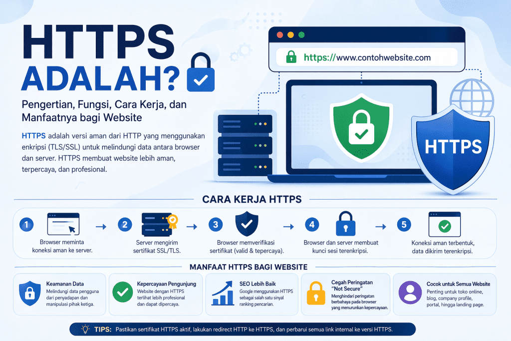 HTTPS adalah singkatan dari HyperText Transfer Protocol Secure, yaitu versi aman dari HTTP yang digunakan browser dan server website saat bertukar data. HTTPS membuat komunikasi antara pengunjung dan website lebih terlindungi, terutama saat pengguna mengirim data sensitif seperti kata sandi, nomor kartu, alamat email, formulir kontak, atau informasi transaksi.